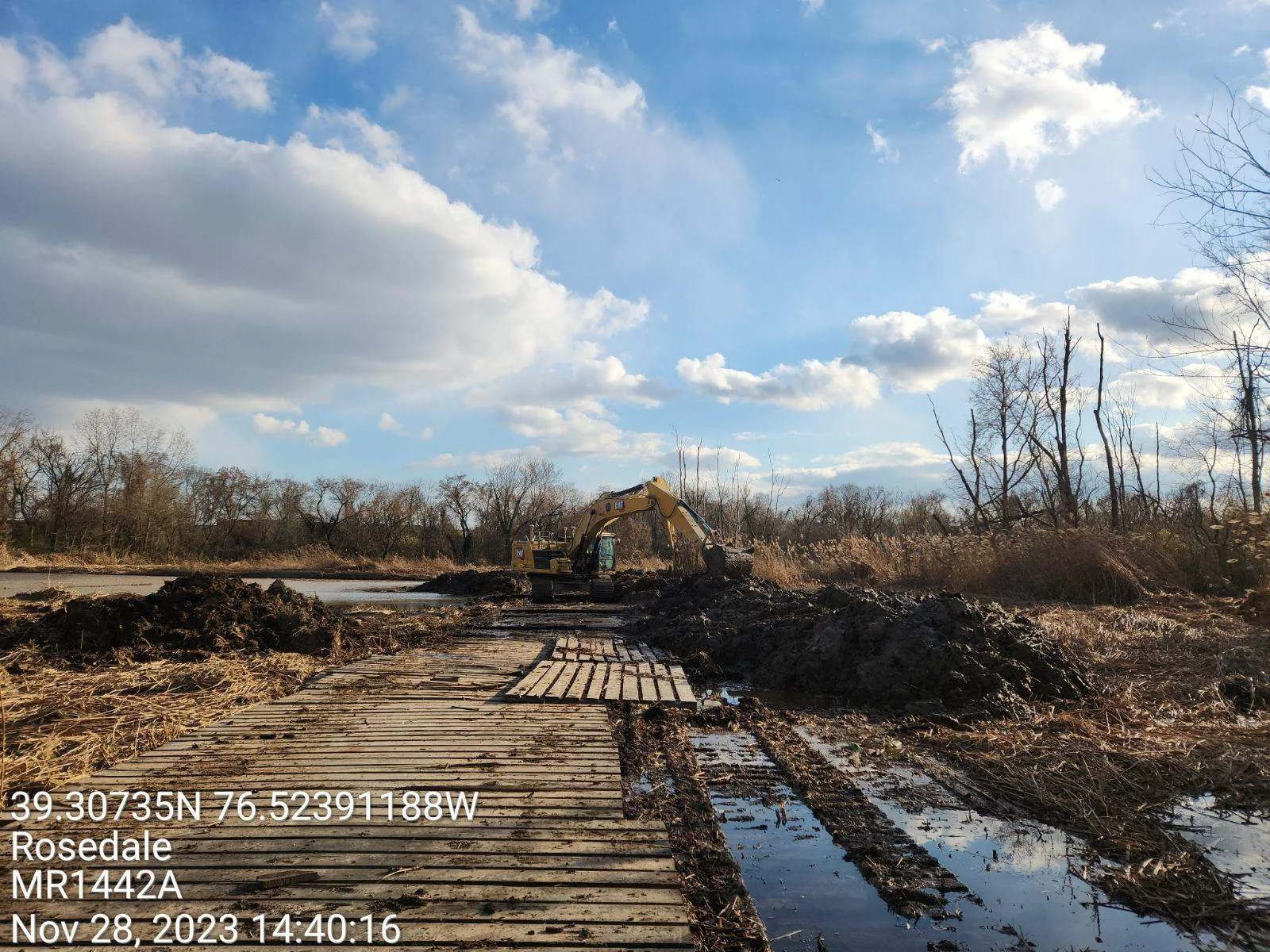 Excavation from Phragmites hydraulic control area east of MA-E. Temporary access in wetlands provided by board roads. Wetlands will be restored upon construction completion.